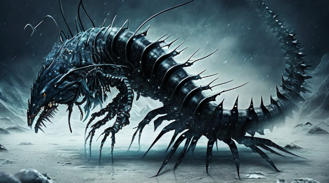 This is a large worm with legs on its heavily armored segments. They live in cold climates and mostly hunt magical and arcane creatures of a slightly smaller size. Often they are discussed by dragons as a danger for their younger generations. They have plenty of deadly ways of dealing with threats and prey alike.